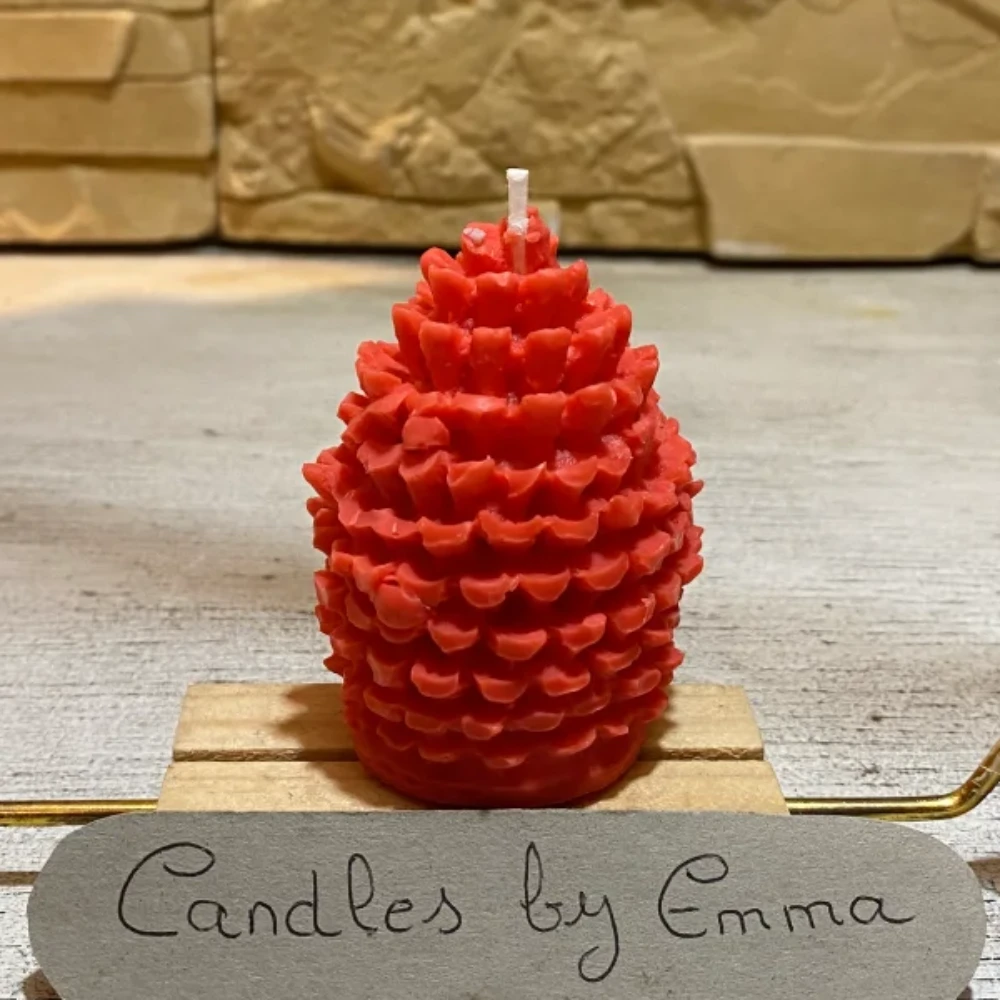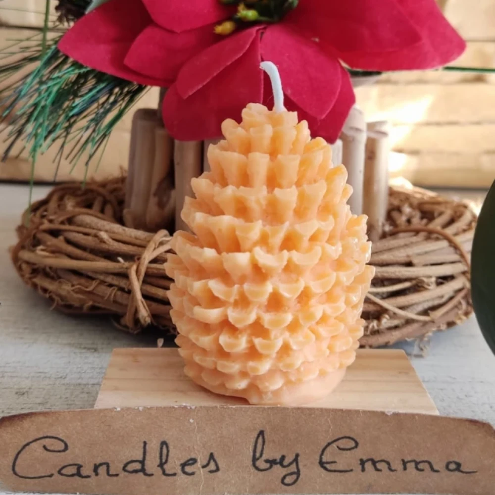 Vela decorativa con forma de piña, elaborada con cera de soja 100% natural. Elaboración artesanal. Personalizable en color y aroma. Ideal para centros de mesa, repisas y rincones navideños con estilo.