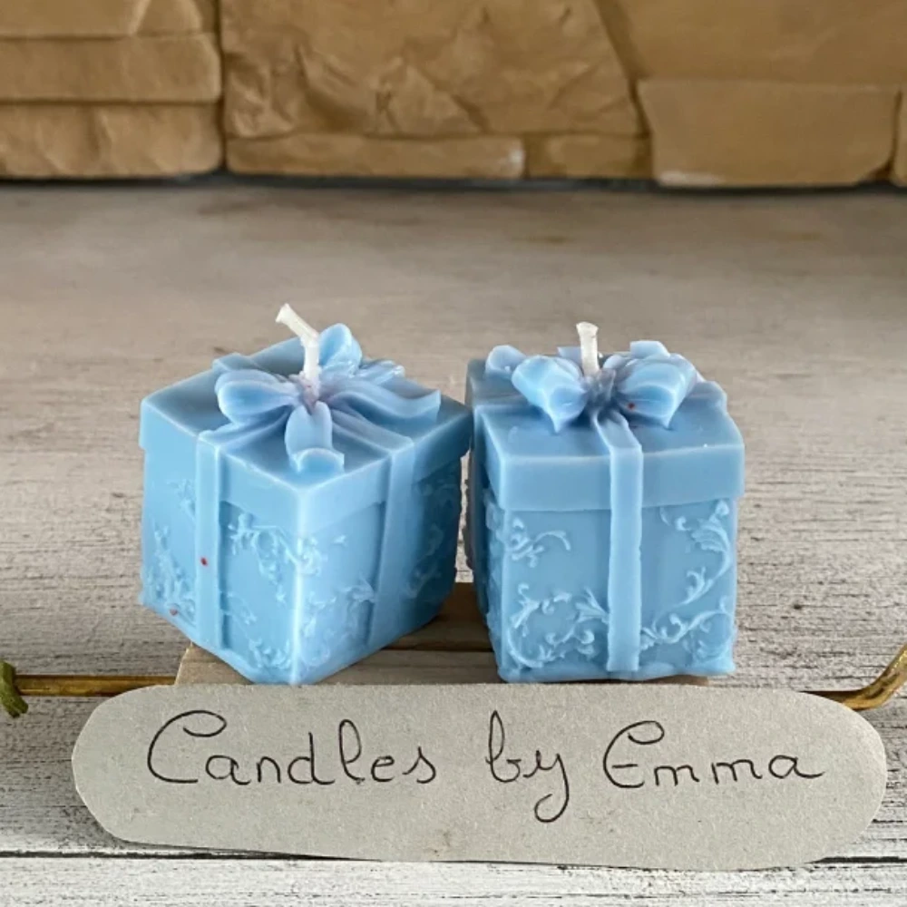 Vela decorativa con forma de regalo navideño y lazo, elaborada con cera de soja 100% natural. Elaboración artesanal. Personalizable en color y aroma. Ideal para centros de mesa y como detalle de Navidad.